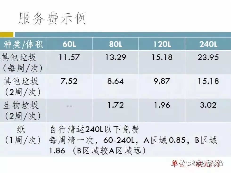 德国的垃圾清运基本上都是有公共公司提供服务的,而服务是需要收费的。在波茨坦,垃圾费由基本费和按量费用来组成,基本费主要用于日常公共清洁、资源回收站的运作(包括有毒、大件垃圾),按量的费用根据垃圾的种类、垃圾桶的大小以及运输频率来核算,每个房子根据自己需要(如果是公寓,由房东来决定),预订合适大小和足够的垃圾桶,并选择垃圾收运的频率,如一周一次,一周两次,两周一次等。在汉堡,如果预订一周一次的其他垃圾运输服务的话,60L的收取每月11.57欧元的费用,80L的13.29欧元/月,如果两周运一次的话分别是7.52欧元(60L)和8.64欧元(80L)。而生物垃圾便宜很多,80L的两周一次每月1.72欧元。轻质包装不用向市民收取垃圾收运费用,因为德国有一个绿点制度,生产厂家已经缴纳了费用,用于自己产品使用后所产生垃圾的清运和处理。