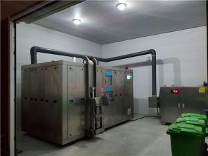 使用餐厨垃圾专用收运车辆将收来的餐厨垃圾倒入集料系统中,经分拣系统将餐厨垃圾中瓶子、塑料、陶瓷等无机杂物分拣出来;剩余物质经传送带输送到破碎机中进行破碎,破碎后的物料粒径在20-30mm 左右,破碎的物料被输送到螺旋压榨机中进行脱水处理,脱